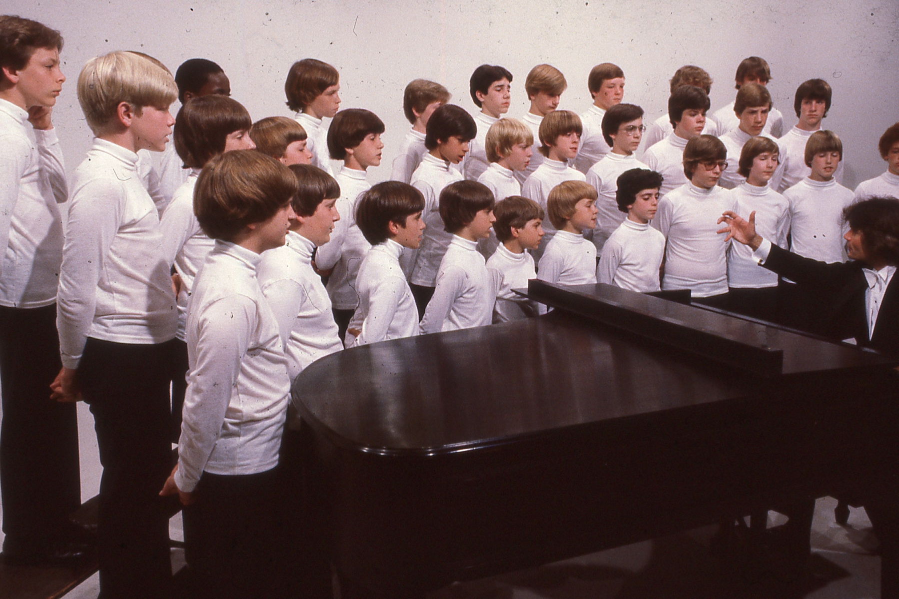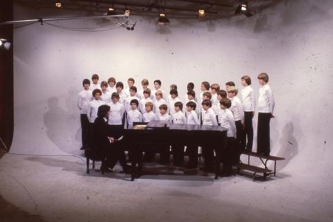 Boys wearing white turtlenecks being filmed while singing