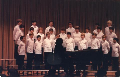 Boys wearing white turtlenecks performing onstage with John Kuzma