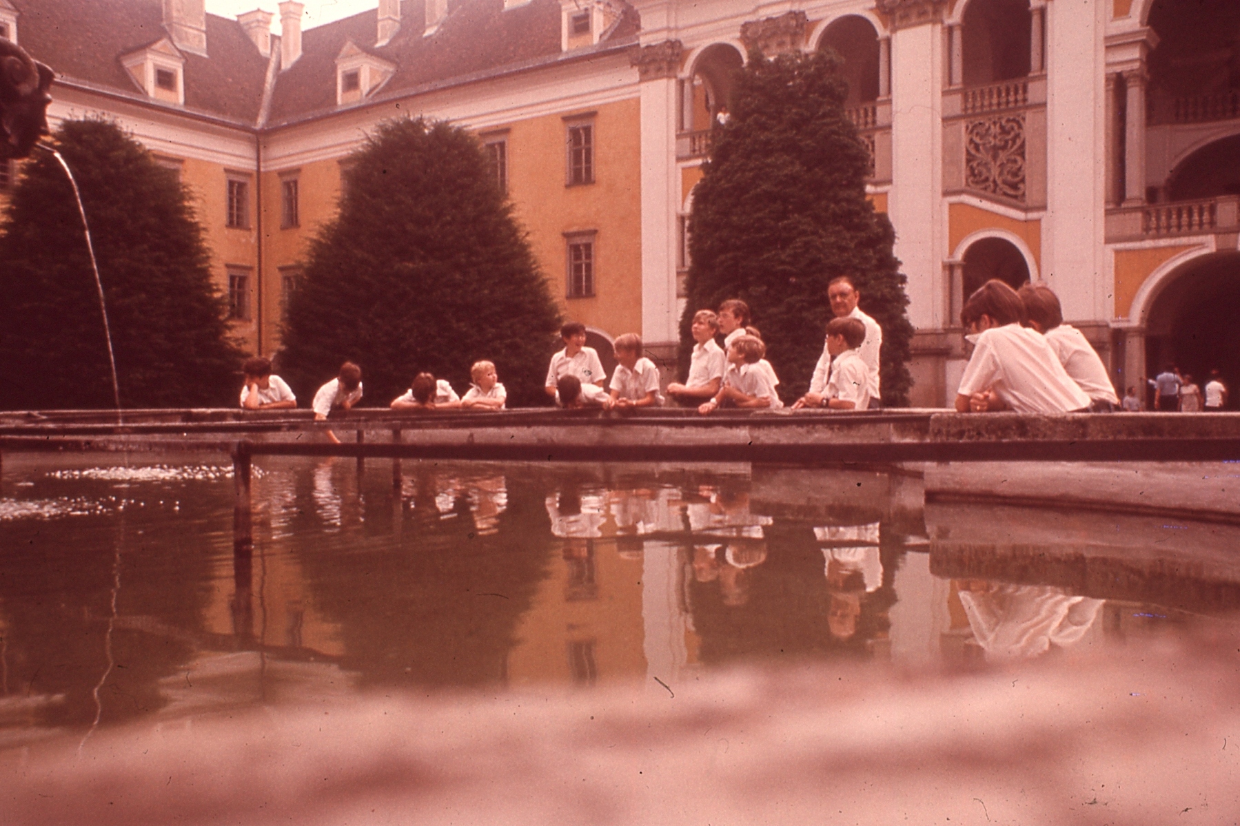 Boys in white button down shirts along with Mr. Graham Matheson outside the St. Florian Monastery in Austria