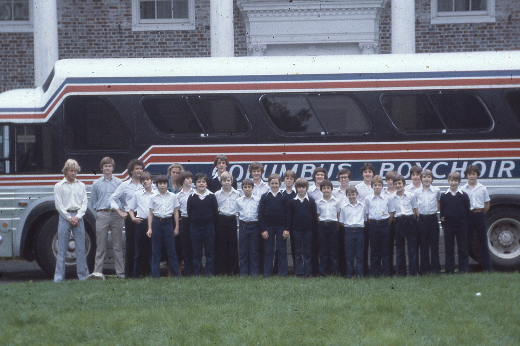 Boys wearing white dress shirts standing beside the Columbus Boychoir bus