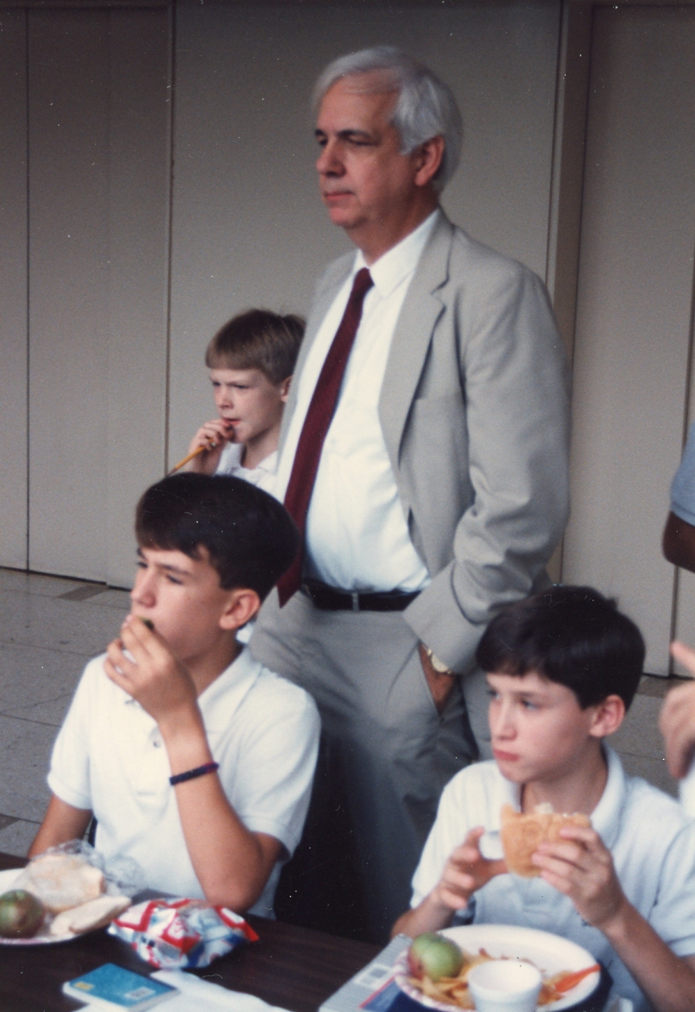 Dr. Litton standing by boys, wearing white polo shirts, eating