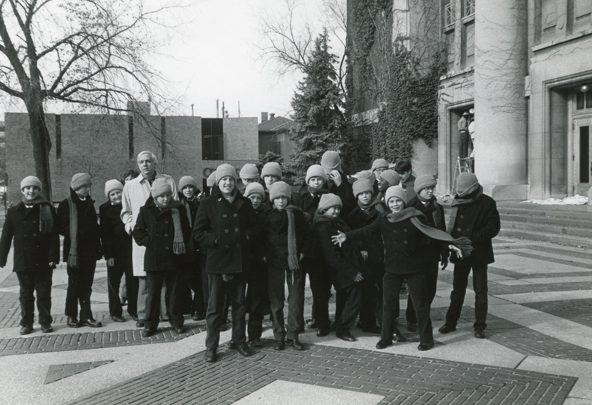 Dr. Litton and boys, wearing winter coats, standing outside of a building