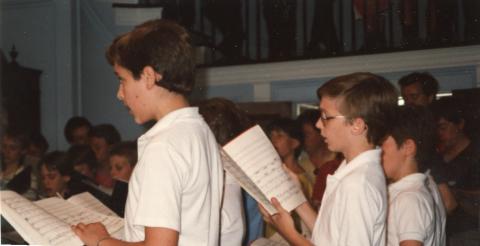 Boys, wearing white polo shirts, singing in the Grand Hall of Albemarle