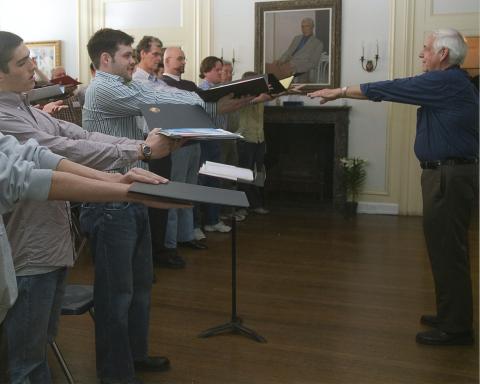 Boys, wearing street clothes, rehearsing inside Albemarle mansion