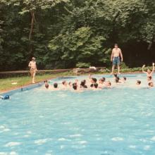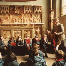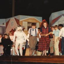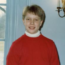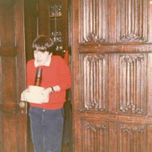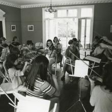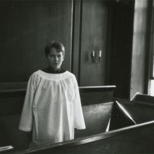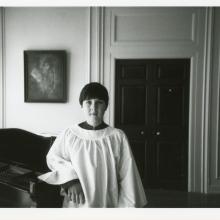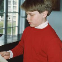 Boy with dark hair, wearing a choir robe, standing beside a piano inside Albemarle mansion