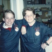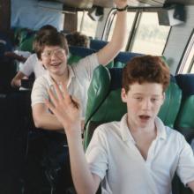 Boys, wearing white polo shirts, sitting at a table having a meal