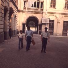 Boys walking outside of the Basilica of Mary Help of Christians in Turin, Italy