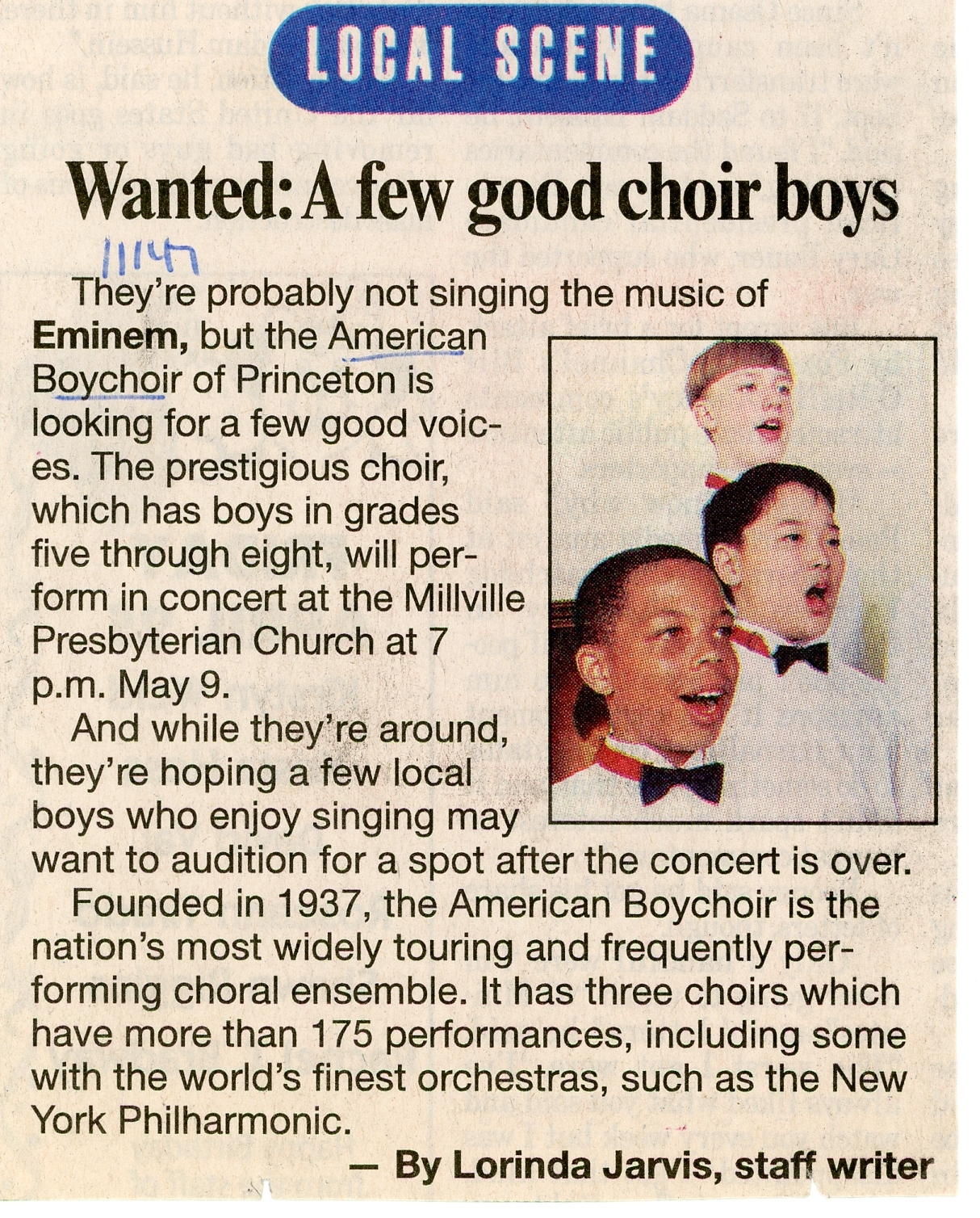 Entry Title Wanted: A few good choir boys Date Fri, 04/25/2003 - 00:00 Archive Type Article Photo Photographs Address Daily Journal 1360 E Washington Street Vineland, NJ 08360 United States Archive Box Number ABS-011 Add new comment Your name Email Subject Comment About text formats Restricted HTML Allowed HTML tags: <a href hreflang> <em> <strong> <cite> <blockquote cite> <code> <ul type> <ol start type> <li> <dl> <dt> <dd> <h2 id> <h3 id> <h4 id> <h5 id> <h6 id> Lines and paragraphs break automatically. Web page addresses and email addresses turn into links automatically. CAPTCHA