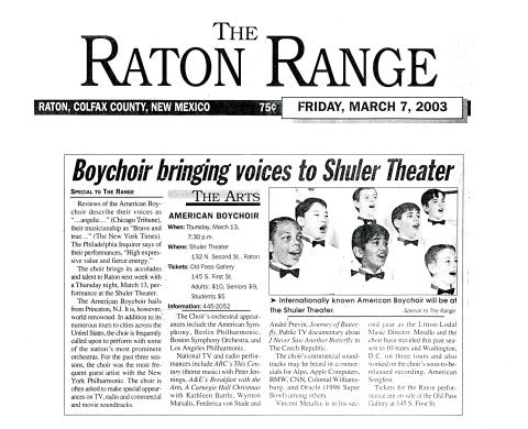 Entry Title Boychoir bringing voices to Shuler Theater Date Fri, 03/07/2003 - 00:00 Archive Type Article Performance Photo Photographs Address The Raton Range Raton, NM United States Archive Box Number ABS-011 Add new comment Your name Email Subject Comment About text formats Restricted HTML Allowed HTML tags: <a href hreflang> <em> <strong> <cite> <blockquote cite> <code> <ul type> <ol start type> <li> <dl> <dt> <dd> <h2 id> <h3 id> <h4 id> <h5 id> <h6 id> Lines and paragraphs break automatically. Web page addresses and email addresses turn into links automatically. CAPTCHA
