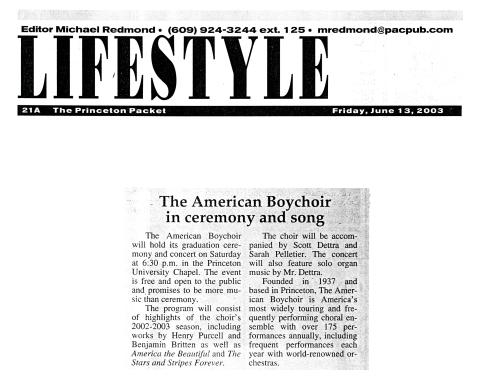 Entry Title The American Boychoir in ceremony and song Date Fri, 06/13/2003 - 00:00 Archive Type Article Photographs Address Princeton Packet Princeton, NJ United States Archive Box Number ABS-011 Add new comment Your name Email Subject Comment About text formats Restricted HTML Allowed HTML tags: <a href hreflang> <em> <strong> <cite> <blockquote cite> <code> <ul type> <ol start type> <li> <dl> <dt> <dd> <h2 id> <h3 id> <h4 id> <h5 id> <h6 id> Lines and paragraphs break automatically. Web page addresses and email addresses turn into links automatically. CAPTCHA