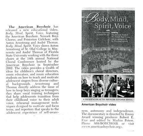 Entry Title Article announcing release of video Body, Mind, Spirit, Voice Date Sun, 08/01/2004 - 00:00 Archive Type Article Recording Photographs Address Diapson Des Plaines, IL United States Archive Box Number ABS-011 Add new comment Your name Email Subject Comment About text formats Restricted HTML Allowed HTML tags: <a href hreflang> <em> <strong> <cite> <blockquote cite> <code> <ul type> <ol start type> <li> <dl> <dt> <dd> <h2 id> <h3 id> <h4 id> <h5 id> <h6 id> Lines and paragraphs break automatically. Web page addresses and email addresses turn into links automatically. CAPTCHA