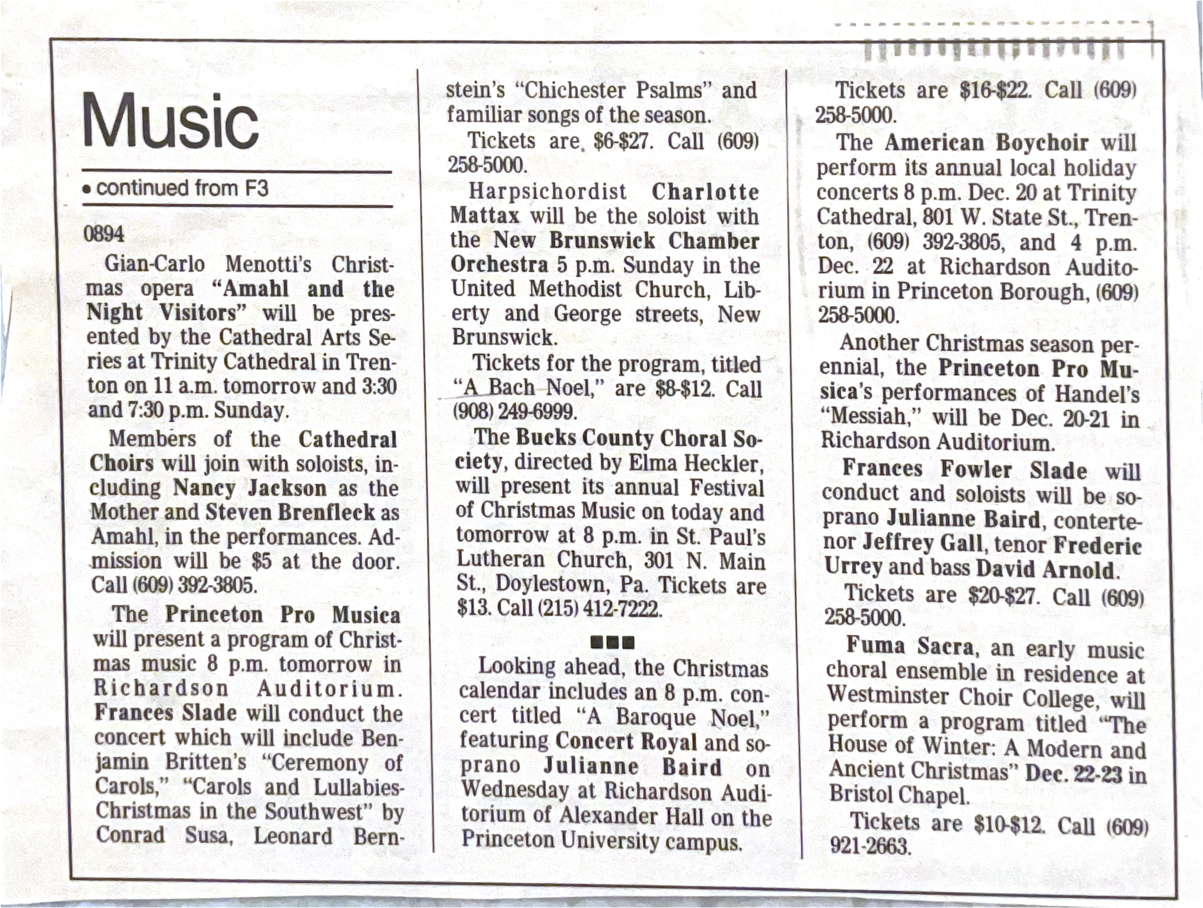 Entry Title Musical gifts in abundance Date Fri, 12/13/1996 - 00:00 Archive Type Article Performance Photo Photographs Address The Times Trenton, NJ United States Archive Box Number ABS-011 Add new comment Your name Email Subject Comment About text formats Restricted HTML Allowed HTML tags: <a href hreflang> <em> <strong> <cite> <blockquote cite> <code> <ul type> <ol start type> <li> <dl> <dt> <dd> <h2 id> <h3 id> <h4 id> <h5 id> <h6 id> Lines and paragraphs break automatically. Web page addresses and email addresses turn into links automatically. CAPTCHA
