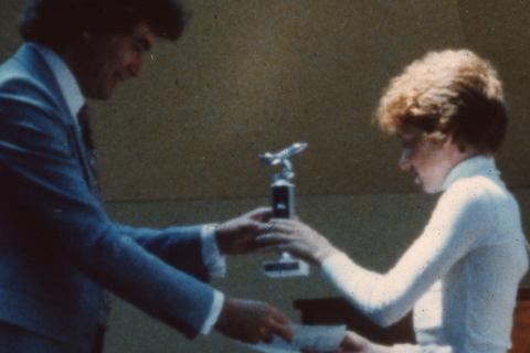 Boy with brown hair wearing white turtleneck receiving a trophy