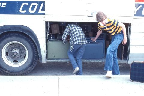 Boys loading or unloading luggage from the Columbus Boychoir bus
