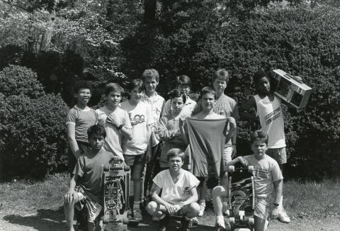 Group photo of boys, wearing street clothes, outdoors; some with skateboards