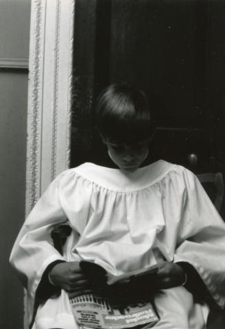 Entry Title Dark-haired boy wearing a choir robe and reading a book Date Thu, 09/01/1988 - 00:00 Archive Type Photo Photographs Description photo stamped SEP. 88 Archive Box Number ABS-012 Add new comment Your name Email Subject Comment About text formats Restricted HTML Allowed HTML tags: <a href hreflang> <em> <strong> <cite> <blockquote cite> <code> <ul type> <ol start type> <li> <dl> <dt> <dd> <h2 id> <h3 id> <h4 id> <h5 id> <h6 id> Lines and paragraphs break automatically. Web page addresses and email addresses turn into links automatically. CAPTCHA