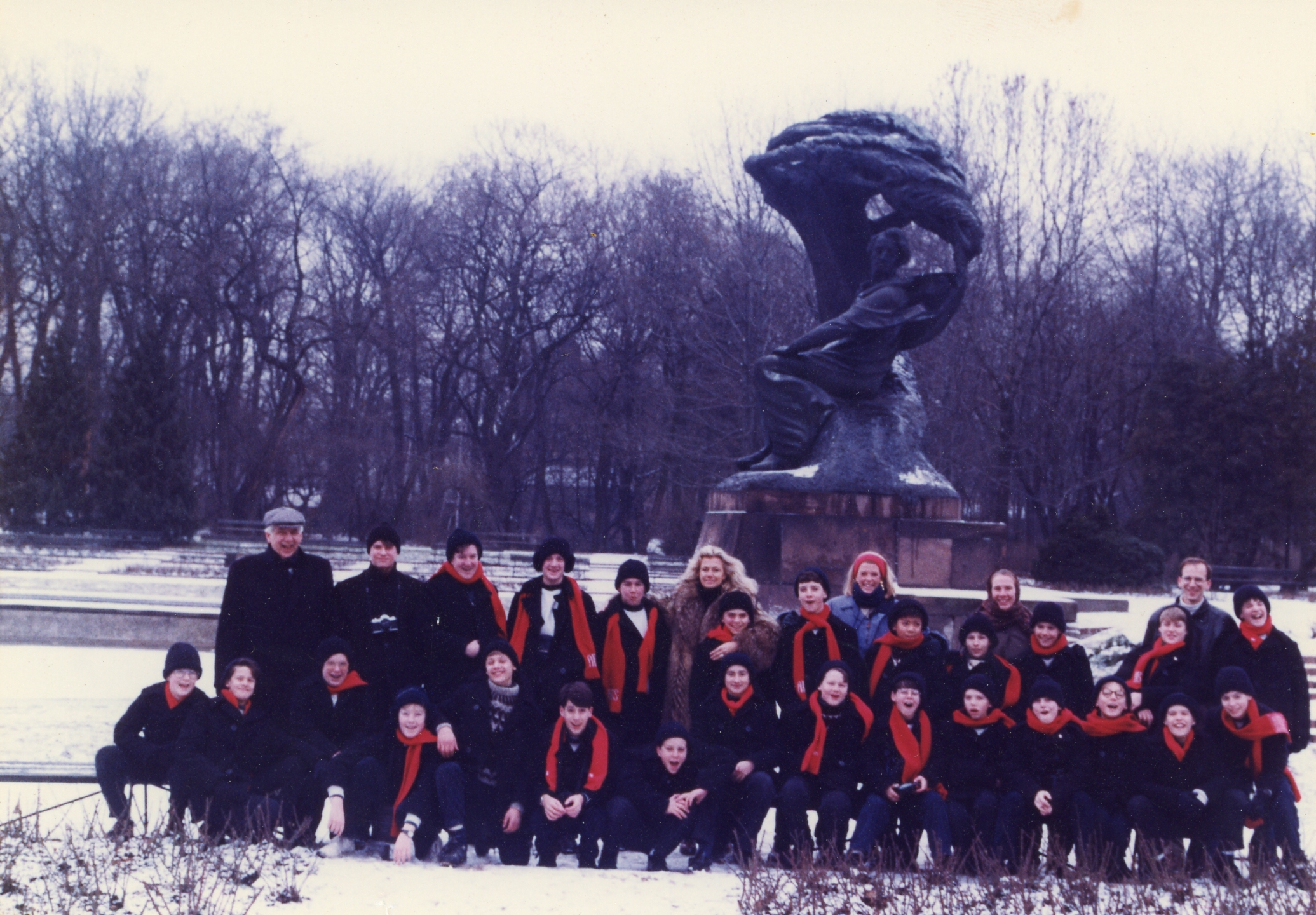 Posing in front of the Chopin Memorial in Warsaw, Poland