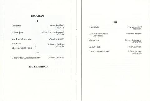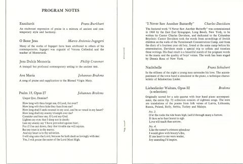 Entry Title "Bravo!" concert booklet with program Date Fri, 01/01/1971 - 00:00 Archive Type Concert Programs Performance Photo Photographs Address New York, NY United States Archive Box Number ABS-012 Add new comment Your name Email Subject Comment About text formats Restricted HTML Allowed HTML tags: <a href hreflang> <em> <strong> <cite> <blockquote cite> <code> <ul type> <ol start type> <li> <dl> <dt> <dd> <h2 id> <h3 id> <h4 id> <h5 id> <h6 id> Lines and paragraphs break automatically. Web page addresses and email addresses turn into links automatically. CAPTCHA