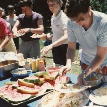 Boys with table of food outdoors