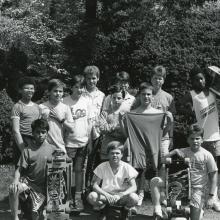 Group photo of boys, wearing street clothes, outdoors; some with skateboards
