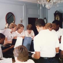 Boys, wearing white polo shirts, gathered around a piano in the Grand Hall of Albemarle