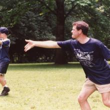 Boys playing frisbee