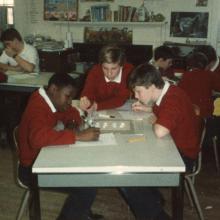 Boys, wearing red sweaters, in science class