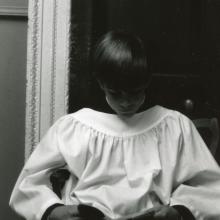 Dark-haired boy wearing a choir robe and reading a book