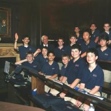 Boys, wearing blue polo shirts, rehearsing inside Albemarle mansion
