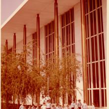 Boys, wearing blue turtlenecks, standing outside of the J F Kennedy Center for the Performing Arts