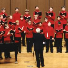 Boys wearing red turtlenecks performing with Dr. Litton directing
