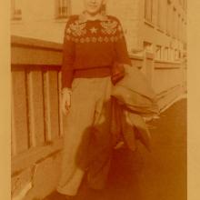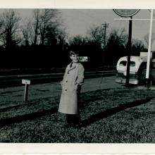 Boy, wearing an overcoat and hat, standing in a snow-covered yard
