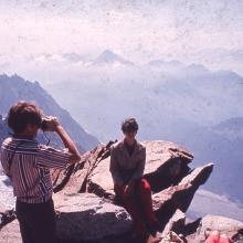 Two boys wearing white dress shirts standing outdoors with a dark-haired man