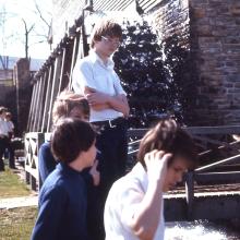 Boys loading or unloading luggage from the Columbus Boychoir bus