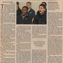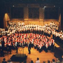 Boys, wearing white polo shirts, singing in the Grand Hall of Albemarle