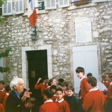 Group photo of boys, wearing vestments, assembled on the staircase in the Grand Hall of Albemarle