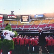 Boys, wearing red sweaters, performing at the Philadelphia Phillies baseball stadium