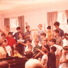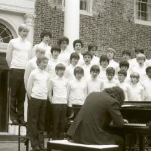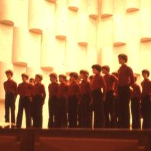 Boys wearing white dress shirts standing beside the Columbus Boychoir bus
