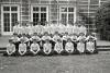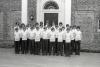 Group photo of boys wearing white turtlenecks standing in front of Albemarle mansion