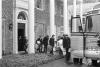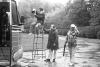 Boys, carrying their travel bags, walking from the front entrance of Albemarle mansion to the Boychoir bus