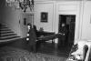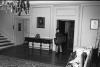 Two boys wearing overcoats carrying choir risers through the Grand Hall of Albemarle mansion