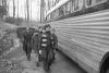 Boys wearing overcoats walking beside the Boychoir bus at Albemarle Estate
