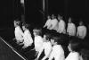 Photos of boys wearing turtlenecks rehearsing in the loggia of Albemarle mansion