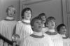 Boys wearing vestments and singing while on the staircase in the Grand Hall of Albemarle mansion