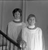 Two boys wearing vestments and standing on staircase in Grand Hall of Albemarle mansion