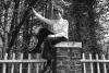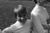 Boys wearing turtleneck sitting atop brick pillar in fence row at Albemarle Estate