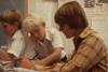Boys wearing white dress shirts doing schoolwork with a teacher