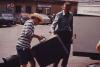 Boys wearing dark sweaters feeding a bird on a city sidewalk