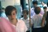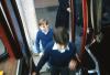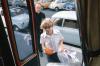 Boy with blonde hair boarding a bus; clergy member behind