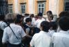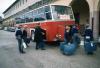 Boys wearing blue sweaters and collared shirts loading or unloading a bus